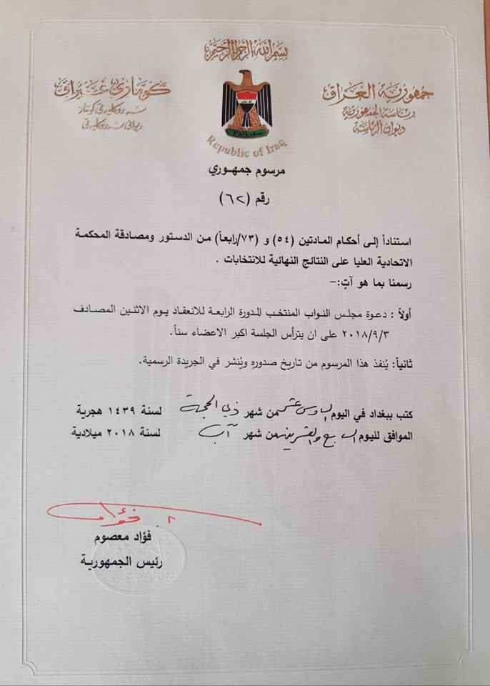 وكالة باسنيوز ... أصدر الرئيس العراقي فؤاد معصوم، الاثنين، مرسوماً جمهورياً يدعو فيه مجلس النواب العراقي المنتخب لعقد أولى جلساته. وبحسب المرسوم فإن أولى الجلسات ستعقد يوم الاثنين 3 أيلول / سبتمبرالمقبل، على أن يترأسها أكبر الأعضاء سناً. وأكبر النواب سناً في الدورة الرابعة للبرلمان العراقي هو محمد علي زيني، وهو مرشح فاز في الانتخابات عن التحالف المدني الذي يقوده السياسي غسان العطية. وسيتعين على النواب انتخاب رئيس للبرلمان ونائبين له بالأغلبية المطلقة وذلك في الجلسة الأولى بحسب ما ينص عليه الدستور. وسيتولى البرلمان انتخاب رئيس جديد للبلاد بأغلبية ثلثي النواب خلال 30 يوماً من انعقاد الجلسة الأولى ثم يكلف الرئيس الجديد مرشح الكتلة الأكبر في البرلمان بتشكيل الحكومة.